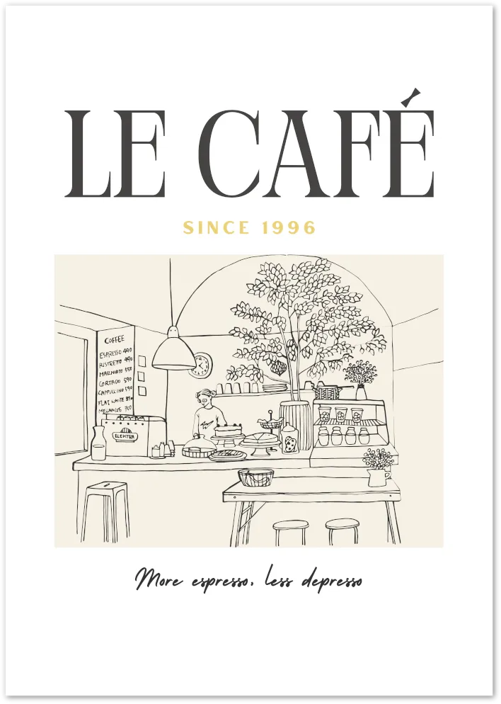 Step into the charm of a cozy Parisian café with this hand-drawn illustration featuring a barista behind the counter, leafy décor, and the playful quote “More espresso. Less depresso.” A must-have for coffee lovers and design enthusiasts alike.