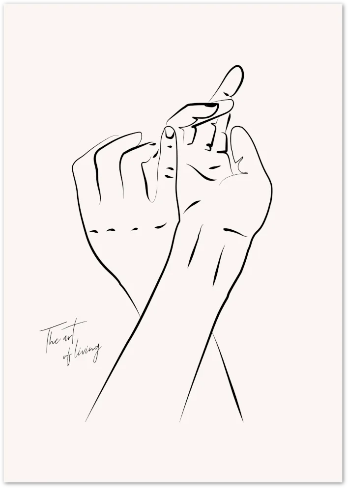 Deze sierlijke poster legt een stil moment van menselijk contact vast met een eenlijnige tekening van zacht ineengestrengelde handen. Perfect voor liefhebbers van eenvoud en subtiele emotie.