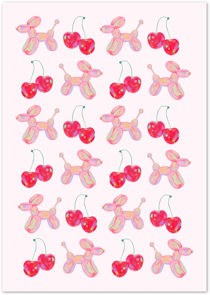 Speelse ballonhondjes en sappige kersen wisselen elkaar af op deze speelse poster in snoepkleur. Puur popplezier.