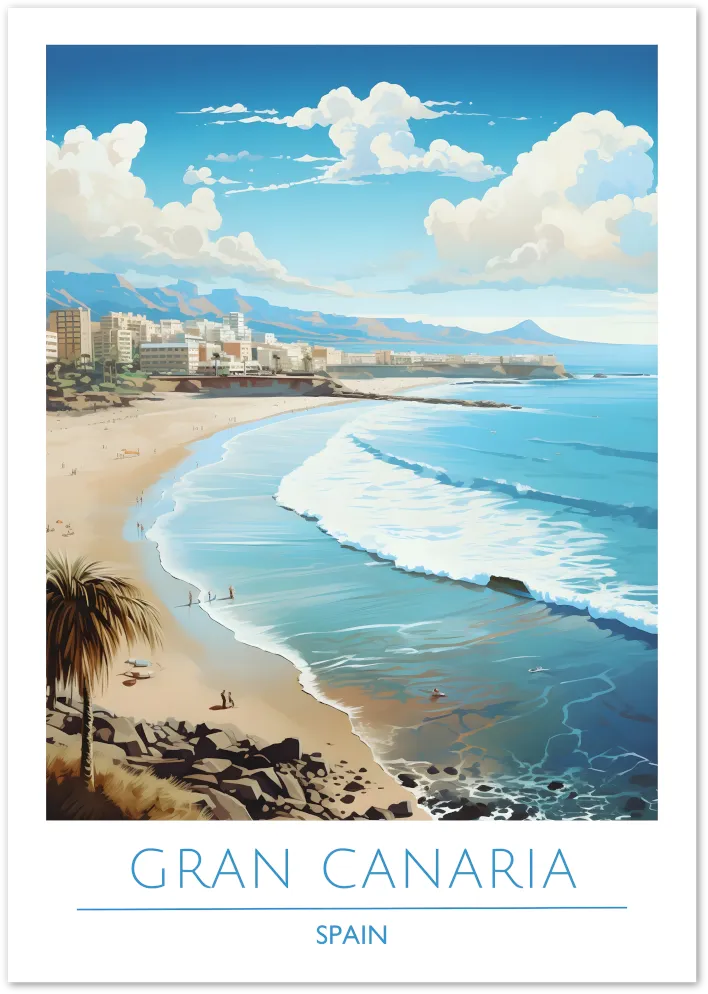 De zandige kusten en de dramatische kustlijn van Gran Canaria schitteren onder zachte wolken en azuurblauwe golven. Een oase van rust in pasteltinten.