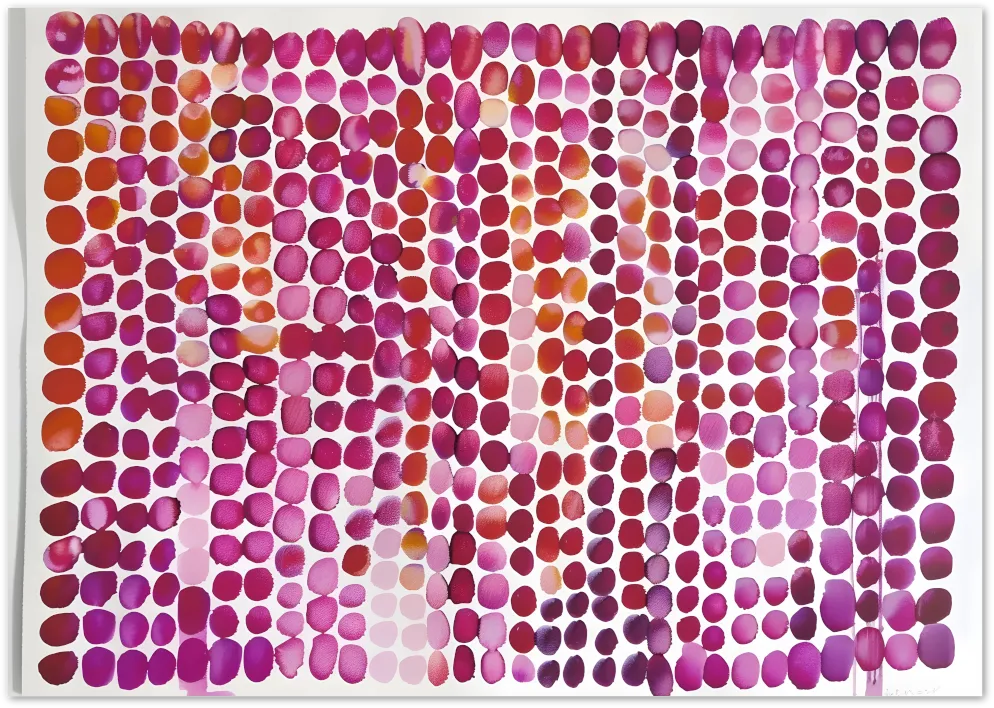 Honderden kleurrijke penseelstippen in roze, koraal en paarse tinten creëren een betoverend abstract patroon. Energiek en modern.