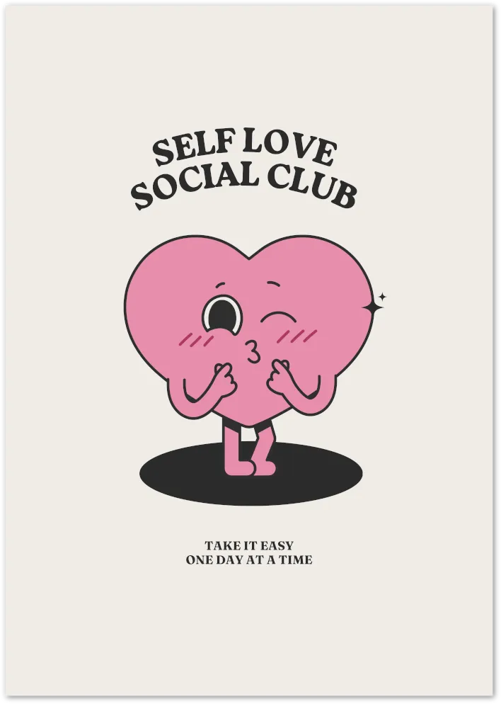 Sluit je aan bij de club van zelfliefde met deze leuke en inspirerende poster met roze hart. Een eigenzinnige en vriendelijke herinnering om het rustig aan te doen, elke dag opnieuw.