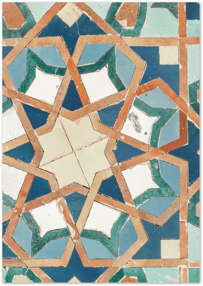 A beautifully detailed close-up of a traditional mosaic, featuring intricate geometric patterns in earthy tones and deep blues. A stunning combination of craftsmanship and history.