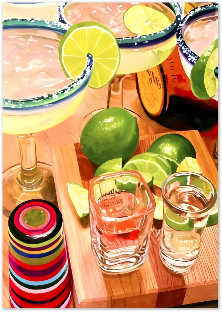 Bring happy hour to your wall with this vibrant margarita scene. Tequila, limes, and colorful shot glasses make this poster the perfect pick for bar areas or party corners.