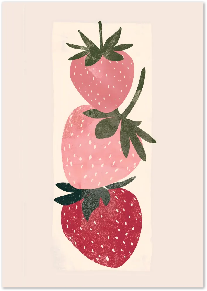 Three plump strawberries in varying shades of pink and red are stacked in a charming and minimal composition. Sweet, fun, and ideal for a fresh kitchen vibe.