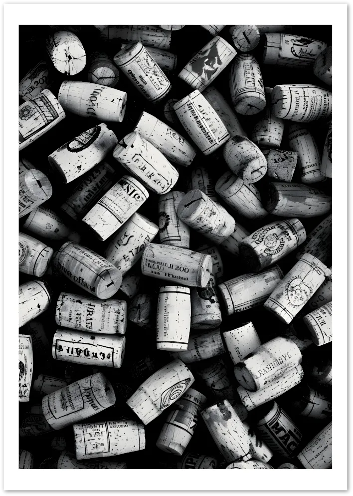 A jumble of vintage wine corks in black and white. Earthy, tactile, and perfect for wine lovers.