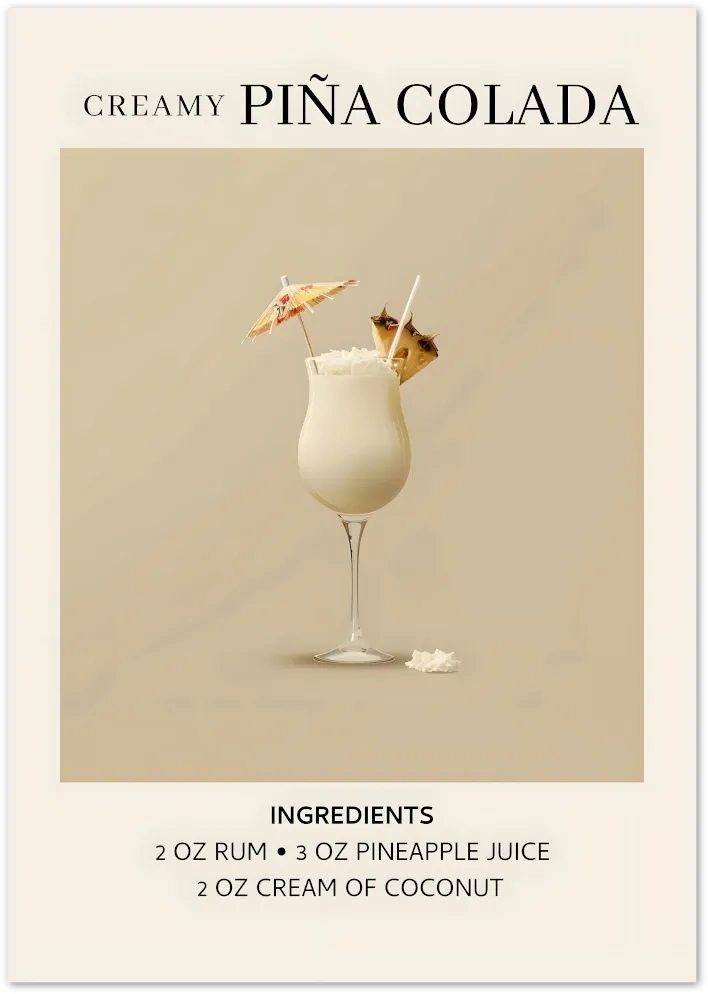 Say hello to island indulgence with this Creamy Piña Colada poster. From the umbrella garnish to the creamy coconut swirls, this piece brings pure holiday vibes and retro tiki style into your space.