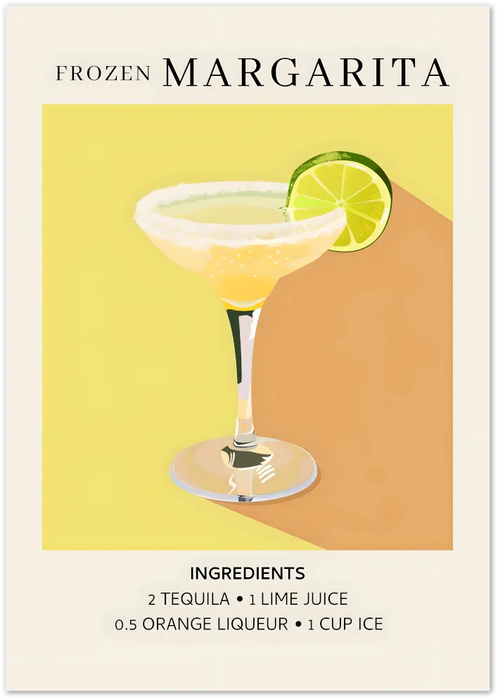 Cool down with this icy pop of citrus joy. The Frozen Margarita poster features a zesty lime twist and pastel yellow palette, making it a fresh and stylish addition to your kitchen or bar space.