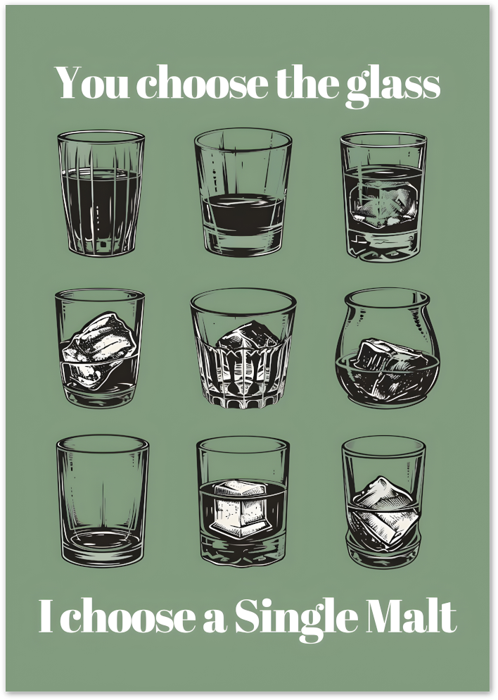 This stylish poster showcases nine illustrated whisky glasses with the quote “You choose the glass, I choose a single malt.” A refined and witty poster that fits perfectly in kitchens, bars, offices or whisky lounges.