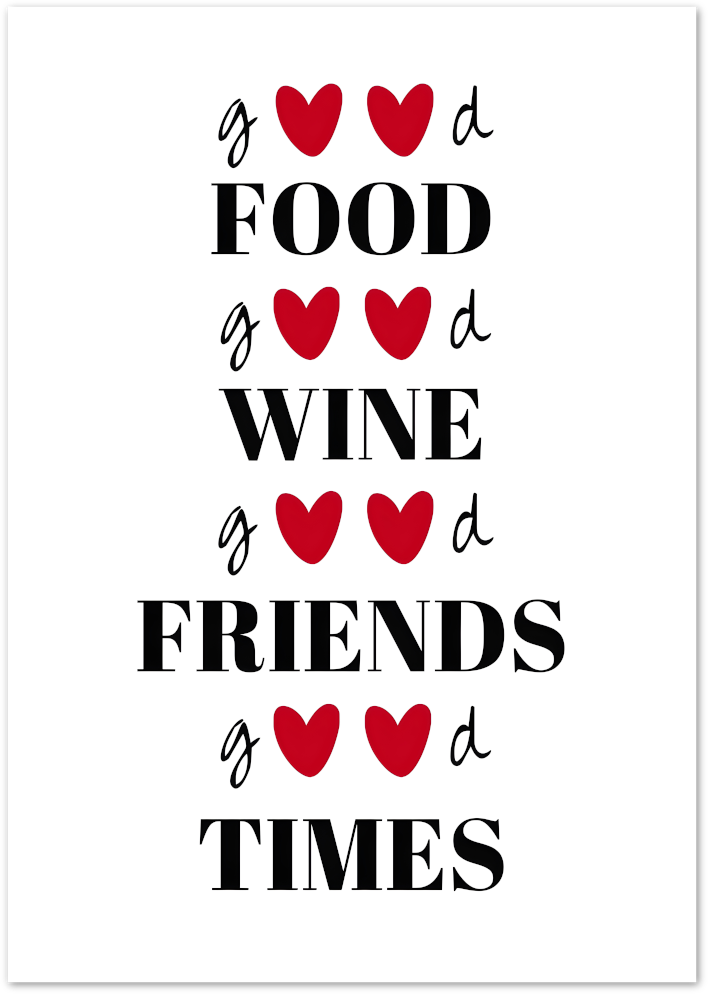 This cheerful typography poster celebrates the simple joys of good food, good wine, good friends and good times. Clean design with playful heart details makes this poster perfect for kitchens, dining areas or cafés.