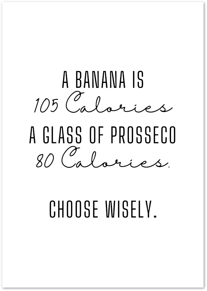 A humorous poster comparing calories with a clever twist. Minimal typography and witty messaging make this poster a light-hearted addition to kitchens, bars or home offices.