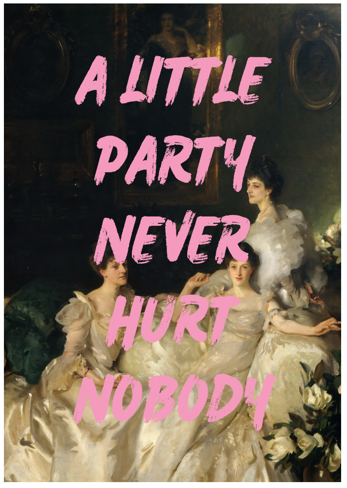 This elegant poster combines a vintage painting with a bold party quote in soft pink typography. The contrast between classical elegance and modern humor makes this poster perfect for lively interiors.