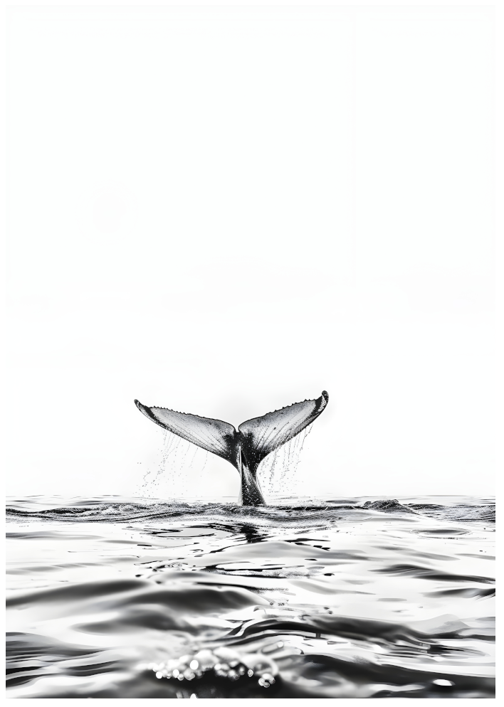 This serene black & white poster captures a whale tail emerging from calm waters. The minimalist composition and natural power make this poster a peaceful and striking addition to any interior.